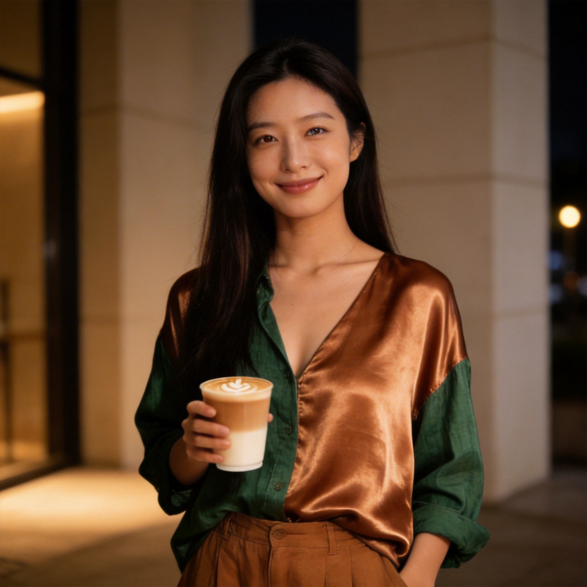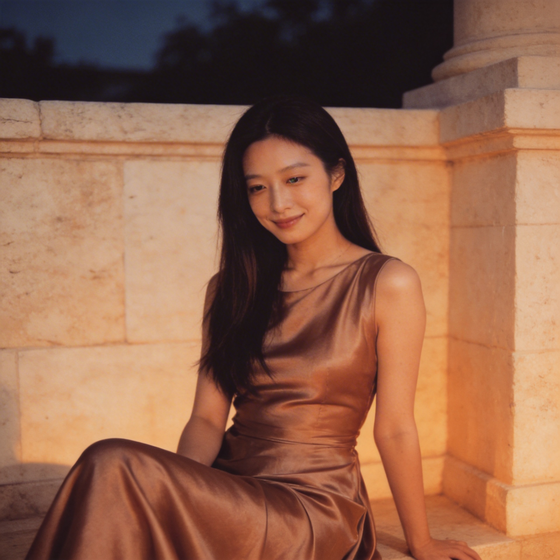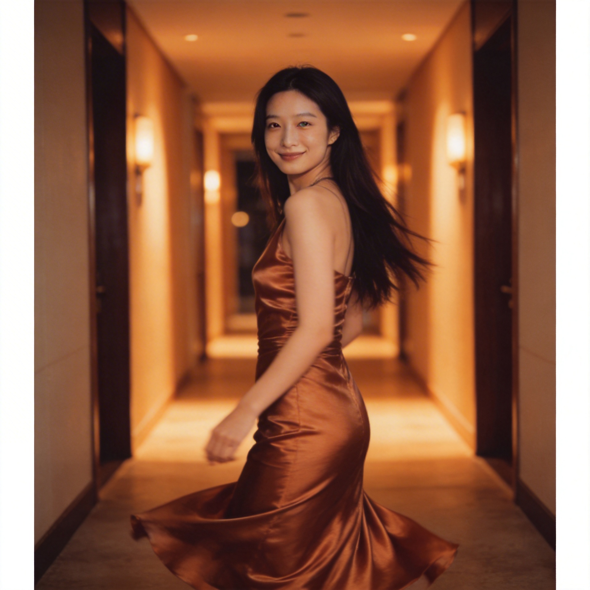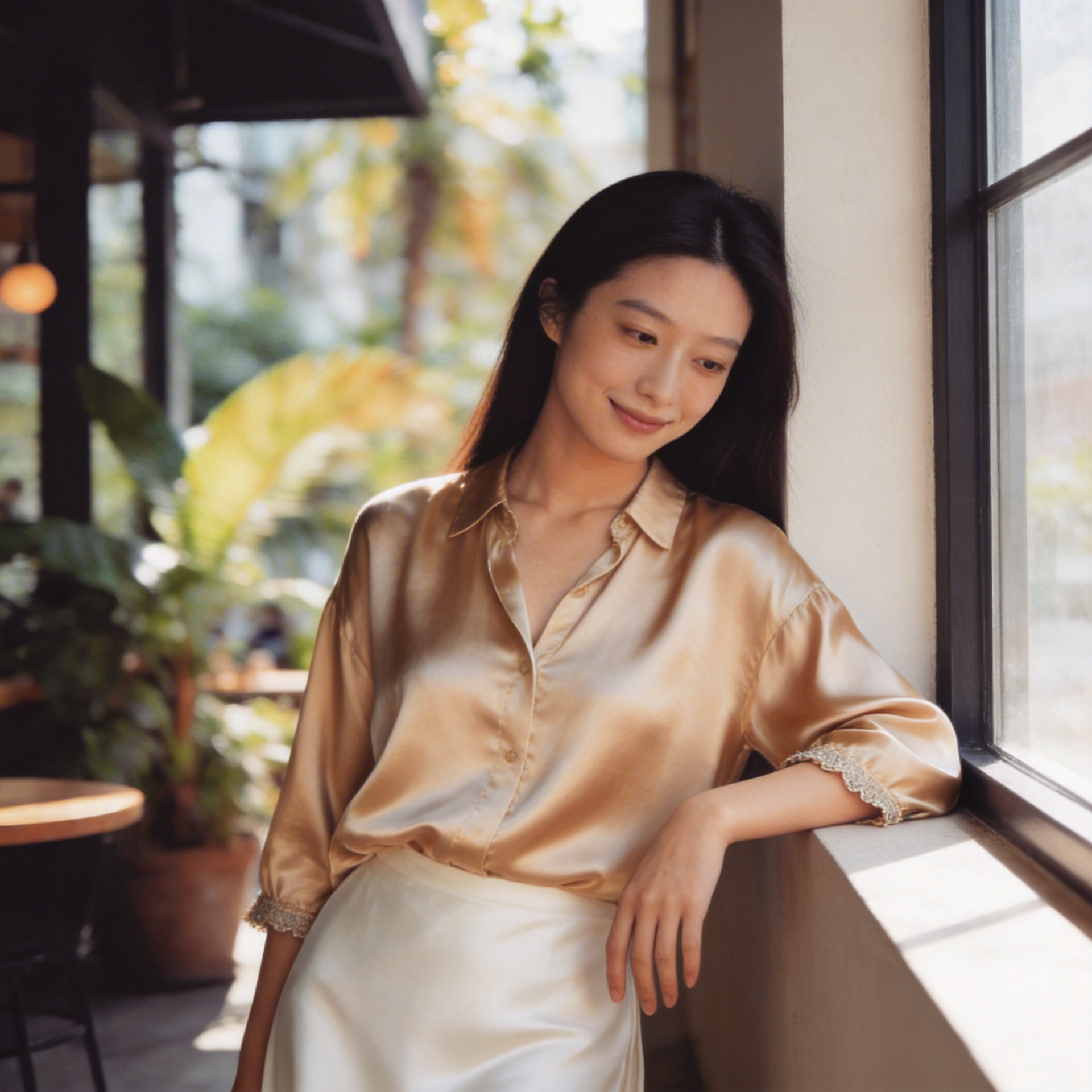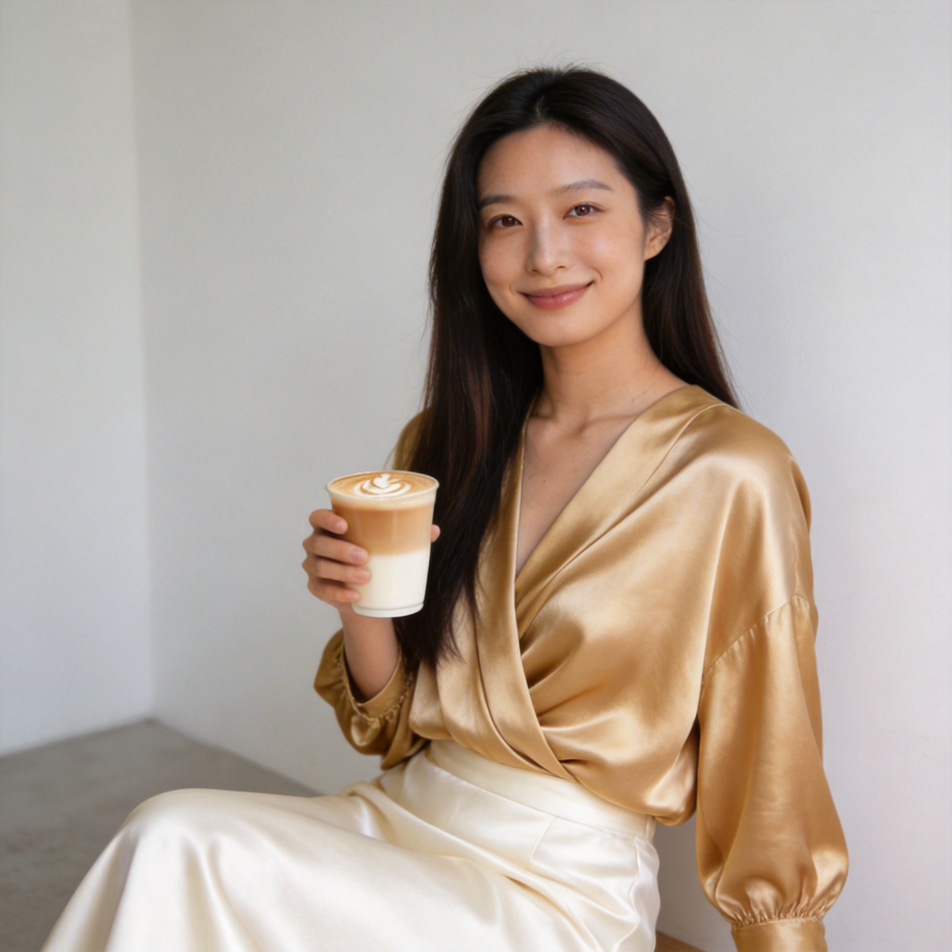 Champagne Satin Quiet LookA satin look designed around lowered gaze, fluid shine, and quiet evening elegance.