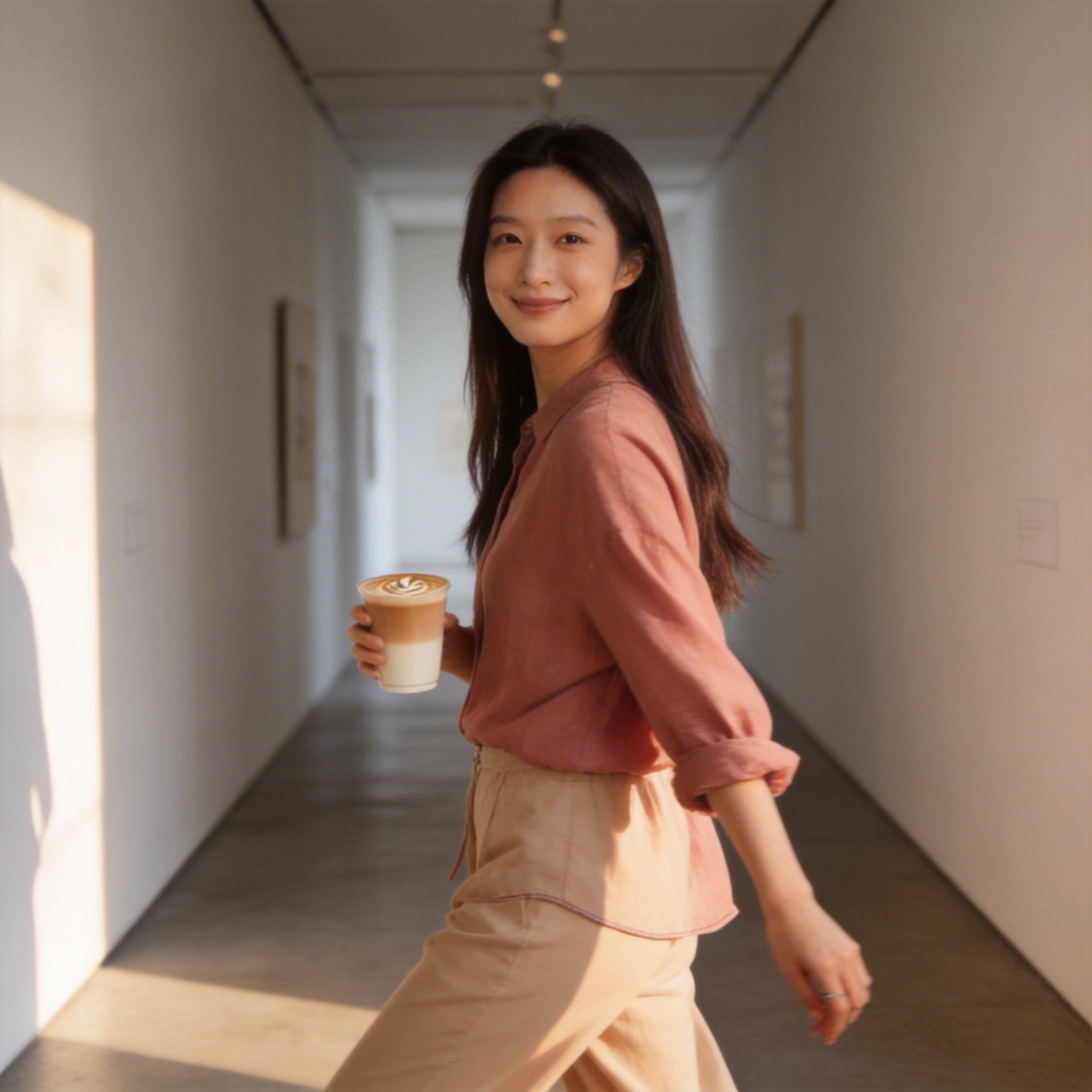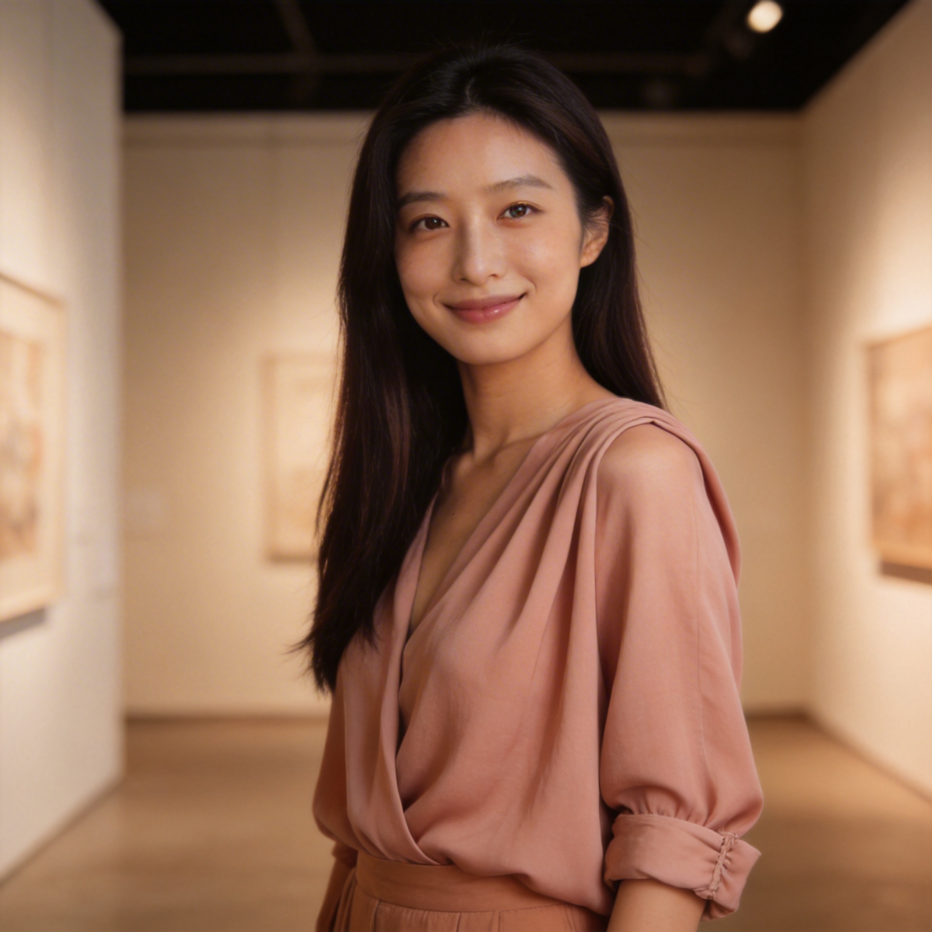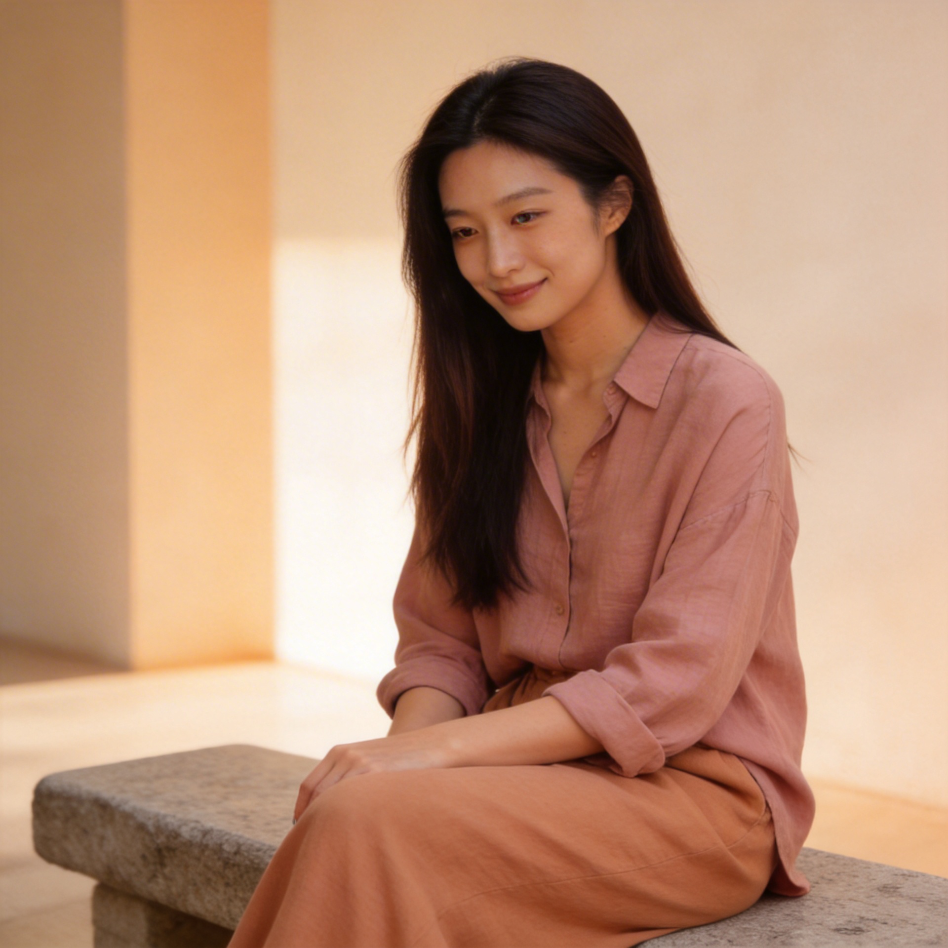 This look sits between softness and structure. The muted rose-beige tone adds warmth without sweetness, while the fluid lower silhouette keeps the overall impression understated and calm. The updated gallery-hour editorial expands the same product family rather than introducing a duplicate SKU.